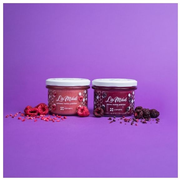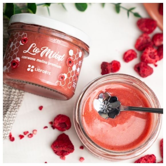 LioMiód z maliną czerwoną liofilizowaną premium Lioforte - miód (100% naturalny i 100% polski, pochodzący z zaprzyjaźnionej, rodzinnej pasieki) połączony z naszą lio maliną czerwoną premium - również w formie drobnego pyłu. Delikatniejsza, ale równie piękna, aromatyczna, pyszna i zdrowa odsłona.