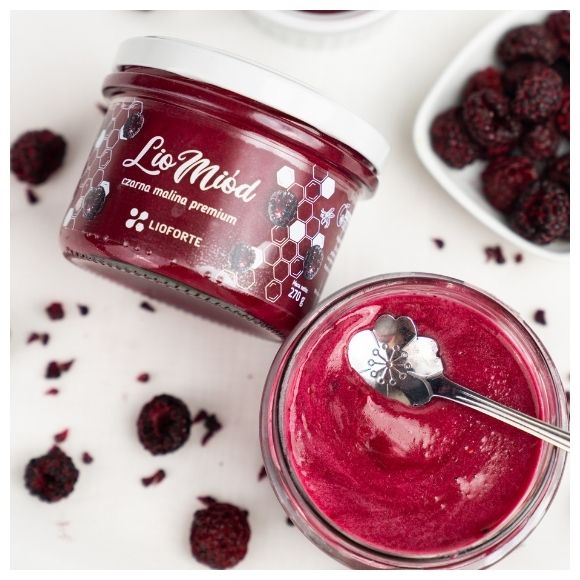 LioMiód z czarną maliną liofilizowaną premium Lioforte - klasyczny miód wielokwiatowy (100% naturalny i 100% polski, pochodzący z zaprzyjaźnionej, rodzinnej pasieki) wzbogacony został naszą lio czarną maliną premium Lioforte w postaci drobnego proszku. Intensywna nuta czarnej maliny dopełnia naturalną słodycz miodu. Każda łyżeczka niesie w sobie kolor, aromat, smak i naturalne, cenne fitoskładniki, z których słynie nasza lio czarna malina premium Lioforte.